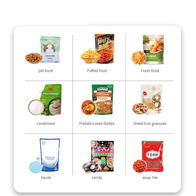- Food industry: it can pack various granular food materials, such as oats, sugar, salt, coffee beans, beans, nuts, dried fruits, candies, pet food, cat food and dog food.